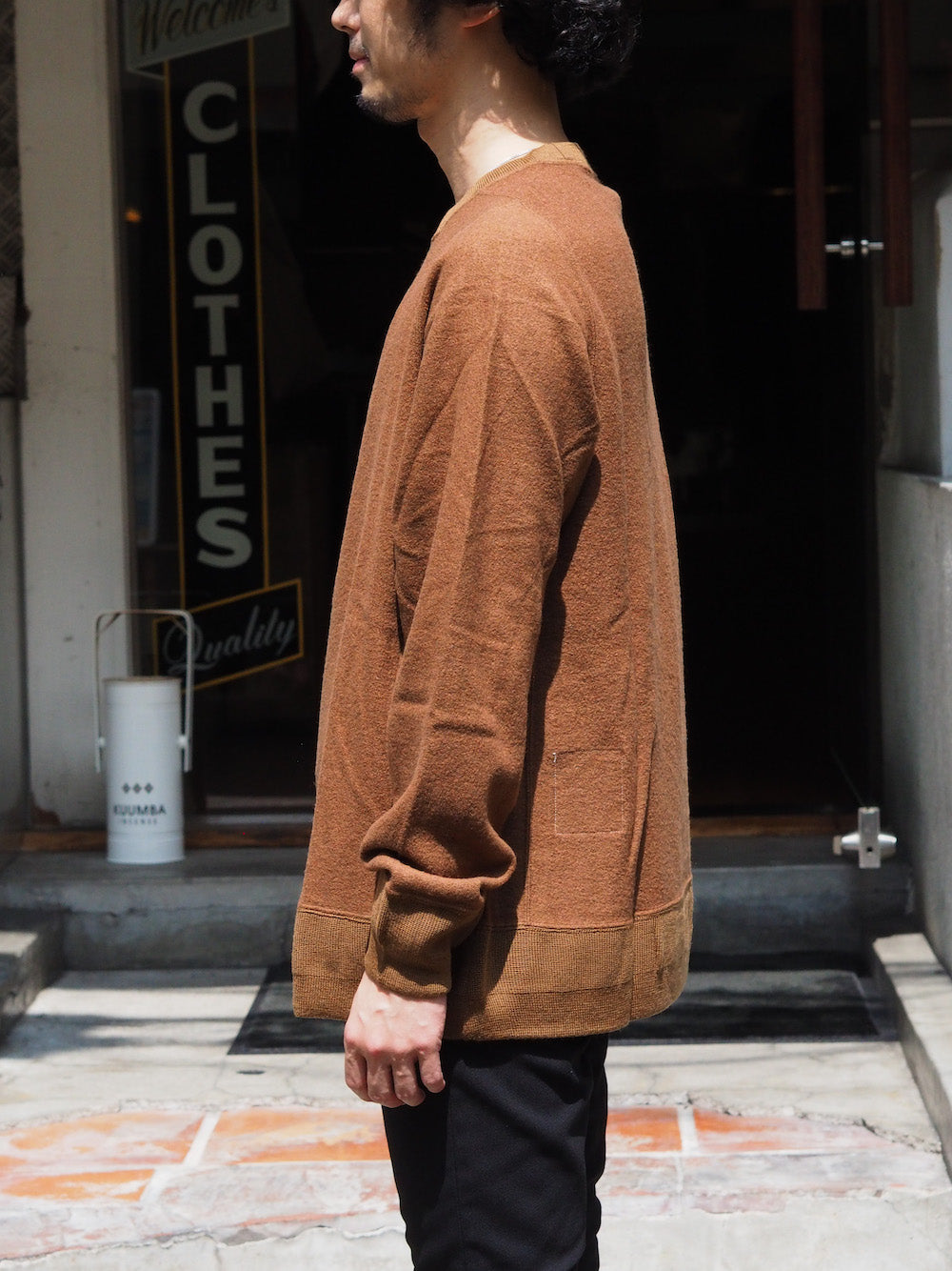 ハリ感と膨らみのあるウールナイロン混紡素材を使用したクルーネックプルオーバーです。ニットのような保温性と袖口に親指が通せるサムホール仕立てが特徴です。