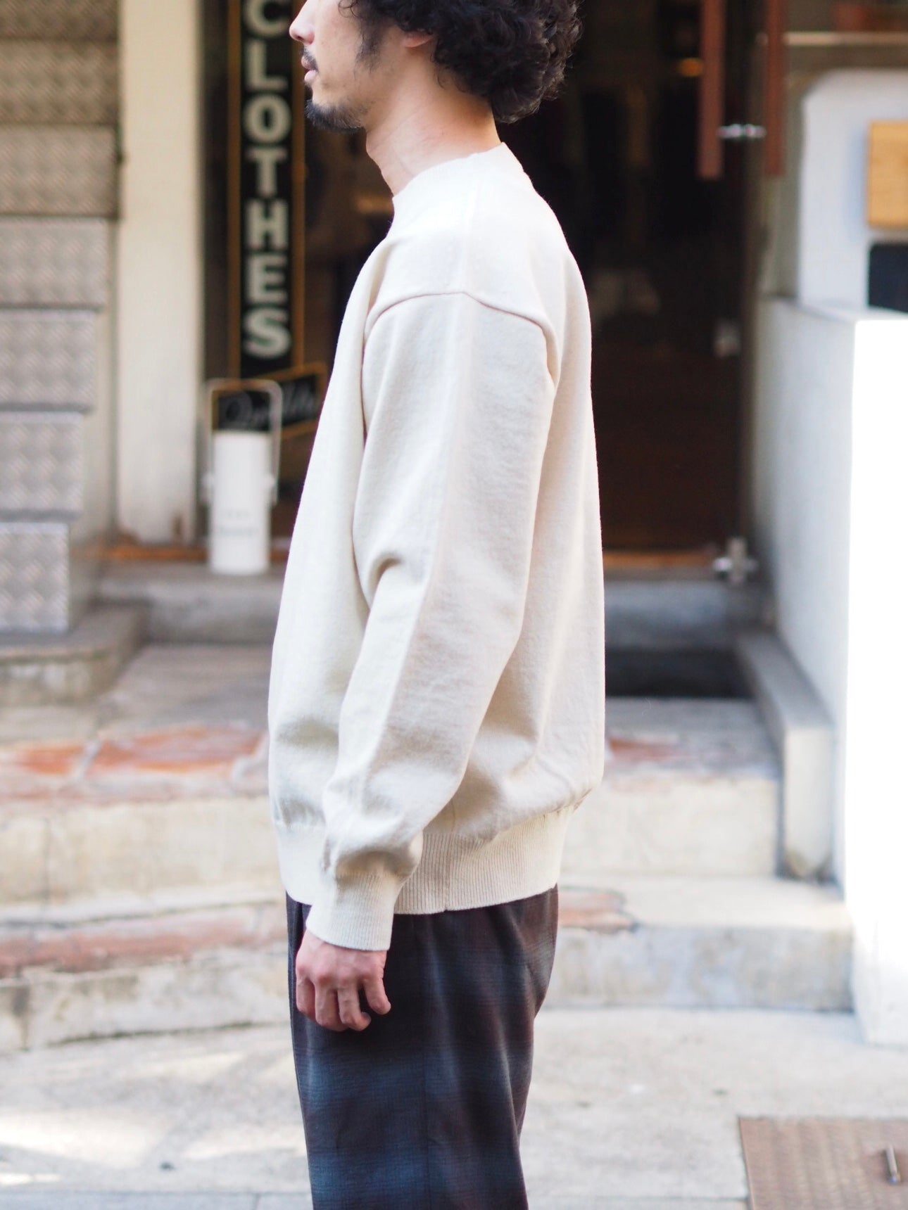無染色・無加工の強燃カシミヤ糸を使用し、極限まで度詰めで編み込まれたカシミヤの風合いは、ご家庭で手洗いによる洗濯処理ができ、経年変化を楽しみながら日常で気兼ねなく着用することができます。