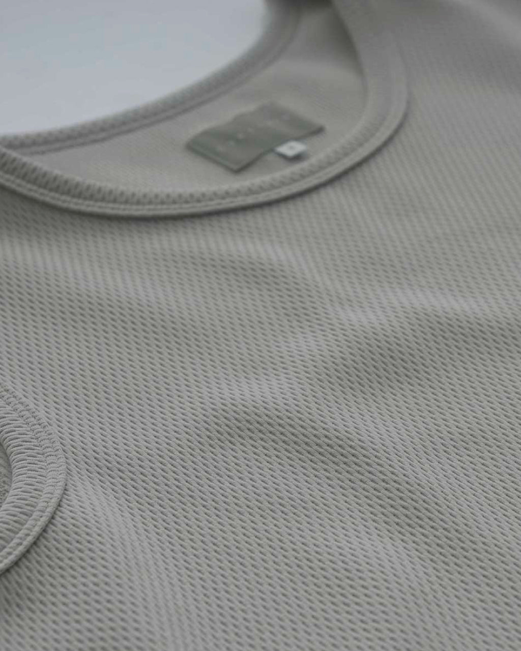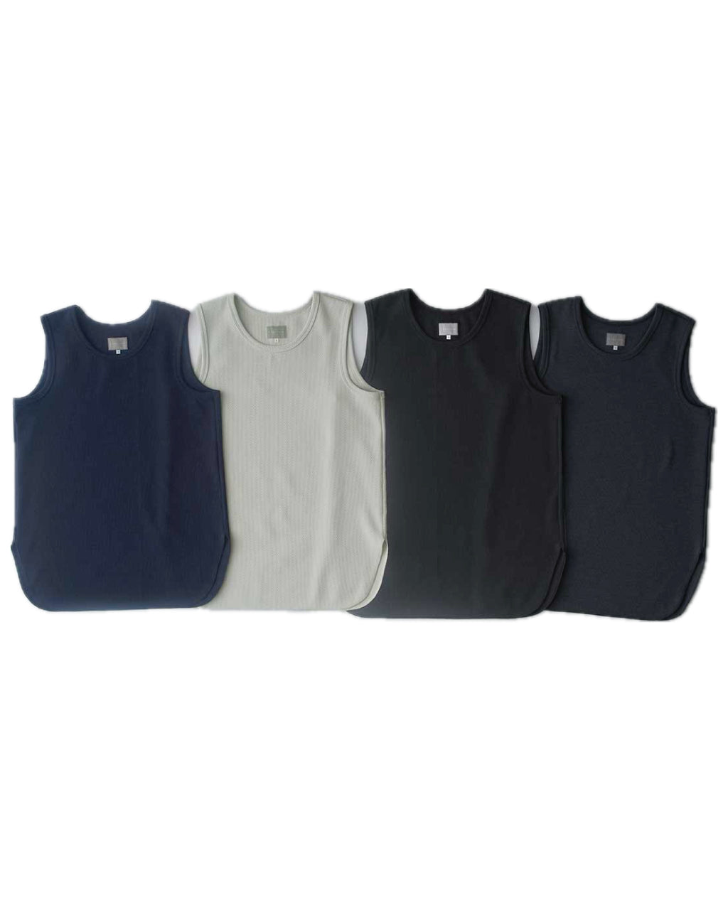 帝人フロンティア(株)の開発素材IRM®を使用したベーシックなワッフルタンクトップ。吸水速乾性、軽量、UVカット、イージーケアと機能性もある素材で、しなやかなストレッチ性とキックバックの良さから来る心地良いフィット感が特徴的です。