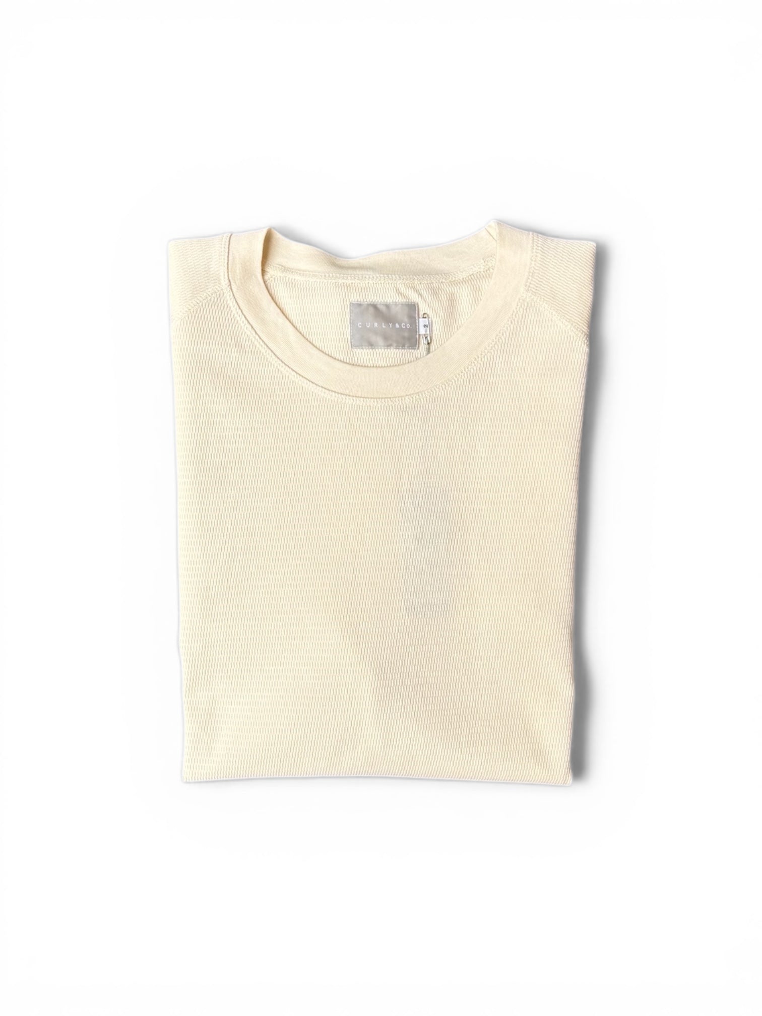ハニカム組織で編まれたジャージー素材を用いたシンプルなプルオーバー。いわゆるサーマルと呼ばれるベーシックアイテムですが、コンパクトヤーンという特殊な紡績技術を使用して作られる糸を用いる事で、通常よりも毛羽立ちも少なく、糸の太さも均一なため自然な光沢感もあり、カジュアル過ぎない仕上がりになっています。裾始末は通常オーバーロックでラフにされがちですが、フライスのバインダー仕立てにしているので1枚での着用もお薦めです。ロンT以上スウェット未満的なアイテム。