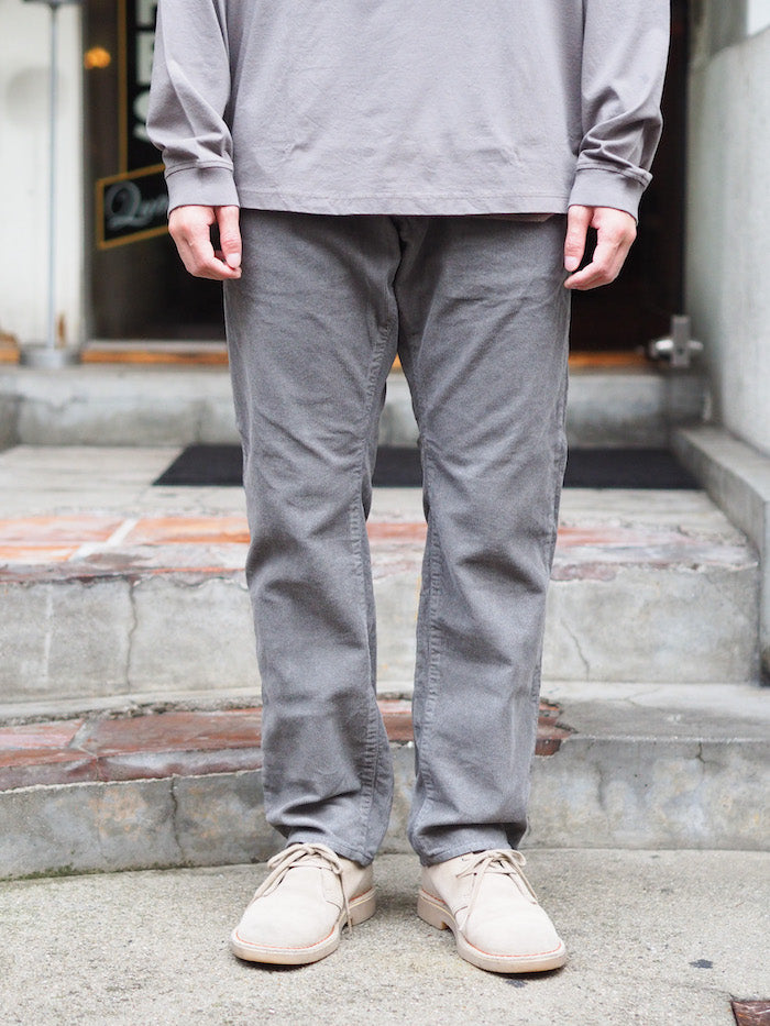 製品染めとウォッシュ加工を施したコーデュロイ素材を使用した「DWELLER 5P JEANS 03」です。ヒップから腿にかけてゆとりをもたせ、裾にかけて緩やかにテーパードするリラックスシルエットが特徴です。