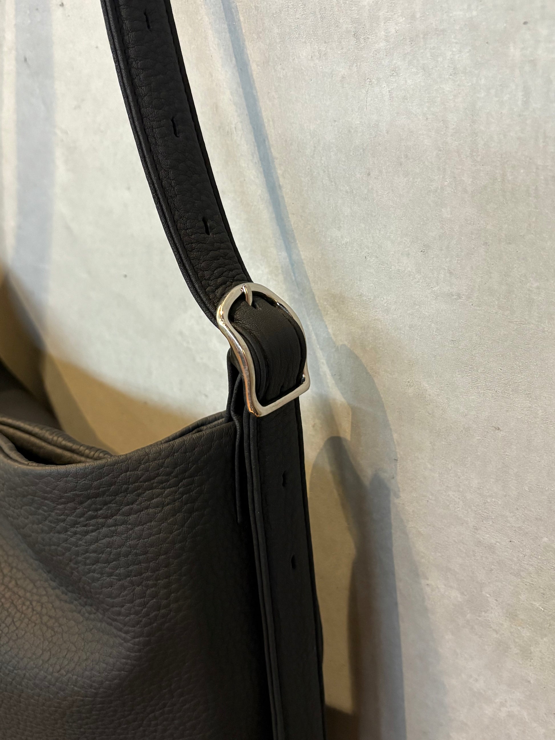 イーラの定番・パイプバッグのリミックス(リエディット)でRE:PIPE BAG。パイプバッグの特徴であるサイドのコンシールファスナー、口元の隠しハンドル(2way仕様)は残したまま、イーラオリジナルバックルをつけてショルダー使いが可能になりました。斜めがけした時に体への収まりがよくなるようなサイズに変更しています。イーオーシュリンクの柔らかさ、品のよい感じも相まって、スタイリングに馴染む、バッグを持ちたくないけれど荷物が多い時のためのバッグというパイプバッグのよさはそのままに、新鮮さもでるバッグに仕上がっているかと思います。