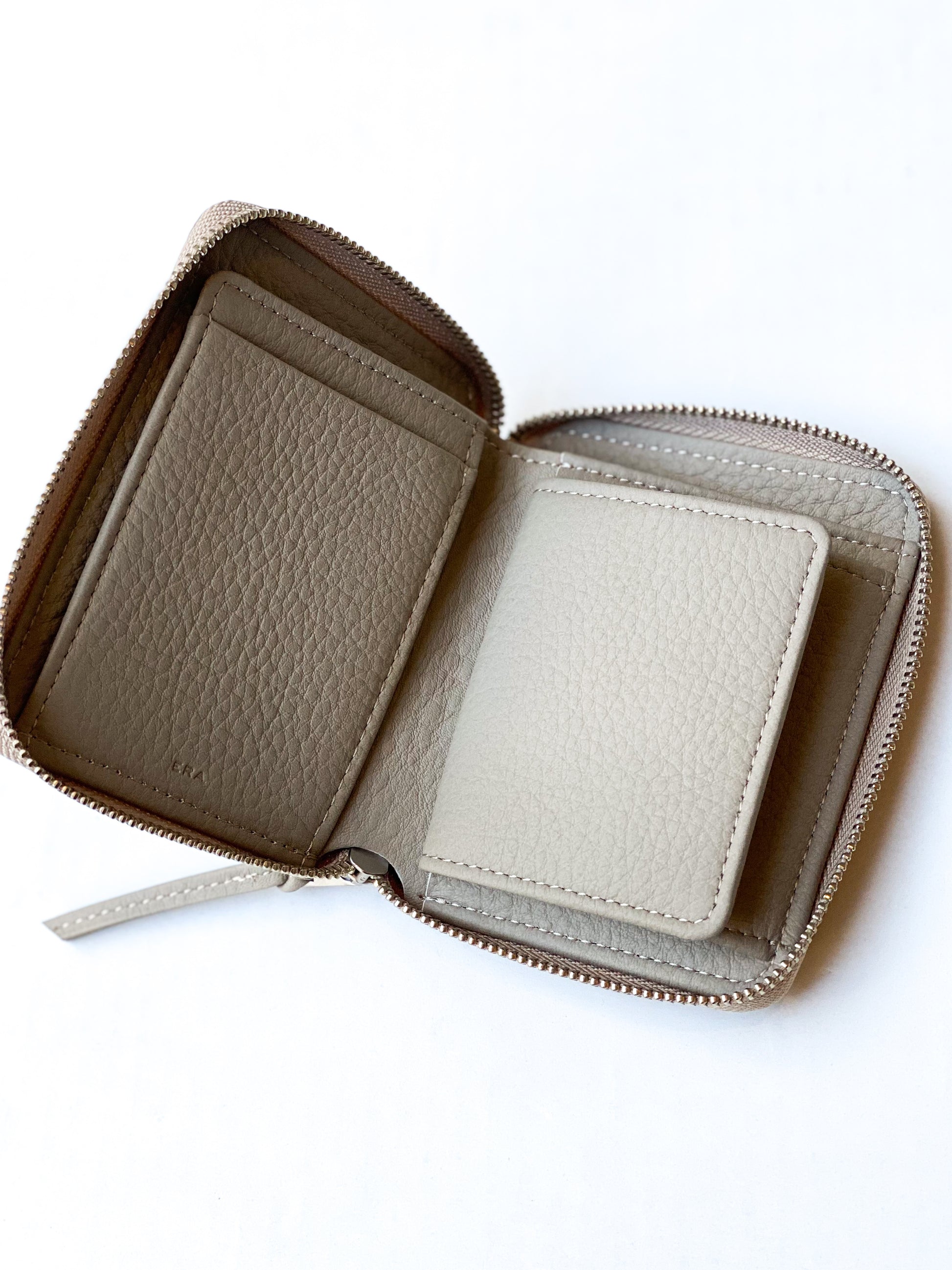 ERA.のアイコンといっても過言ではないコンパクトウォレット。可能な限り小さくした手のひらサイズのラウンドジップ仕様、1万円札は折らずに入り、ボックス型の小銭入れ、カード室は1室ながらカードサイズのフリーポケットが2室あるので複数枚のカードも収納可能。