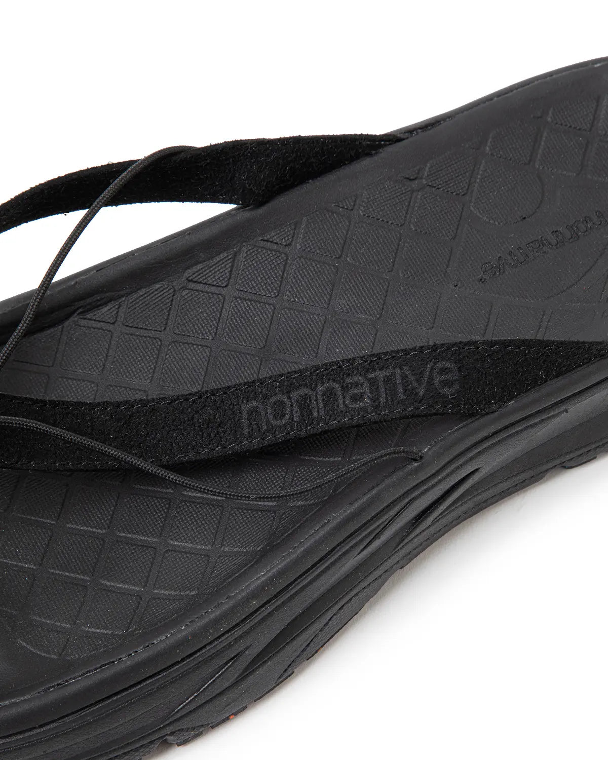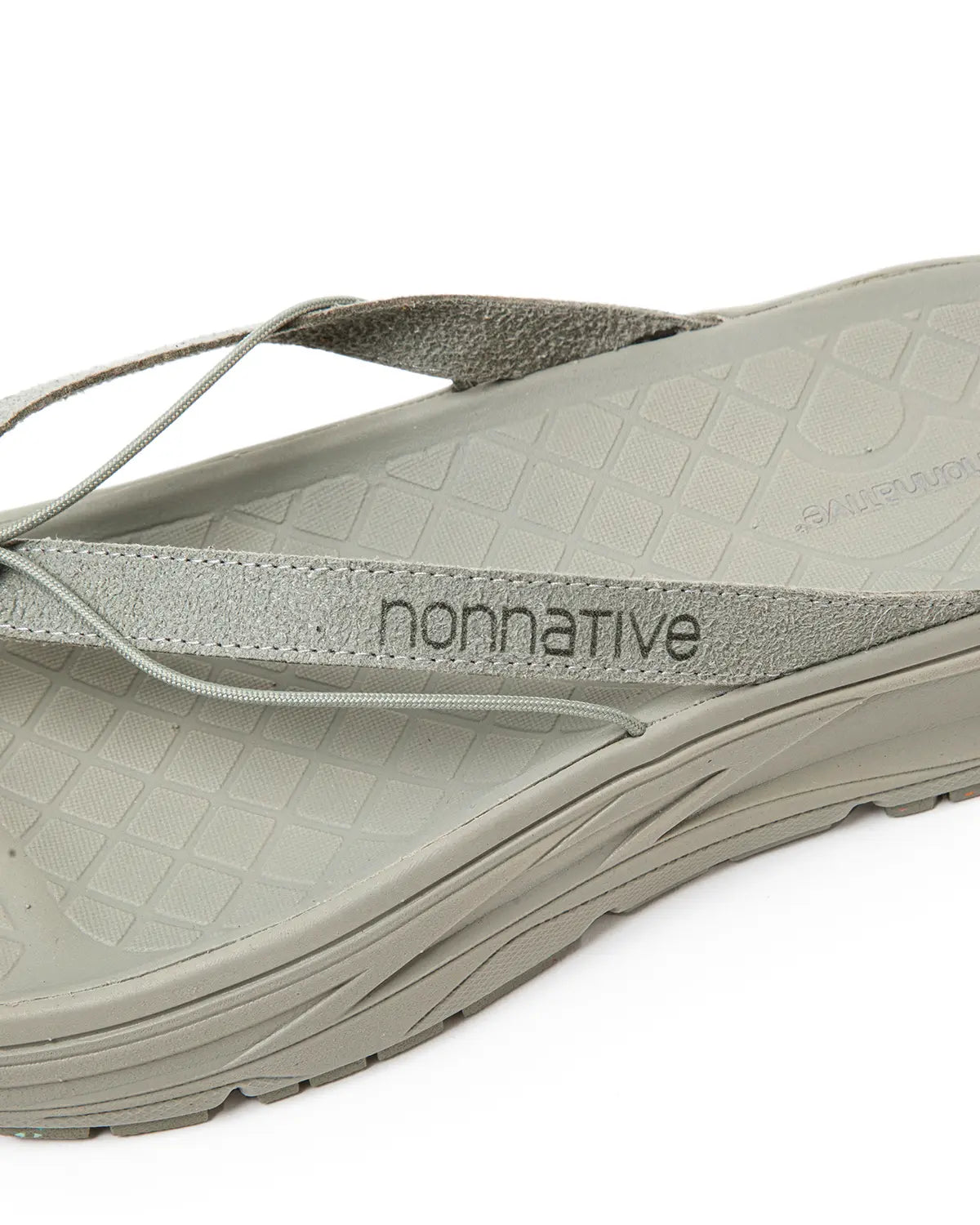 細めにデザインされたトング素材には、しなやかなナチュラルスウェードを採用。 最大の特徴となる中央に配したドローコードで、甲部分をしっかりホールド。コードストッパーによる細かなフィッティングが可能です。 今季のテーマカラーに合わせたKHAKIとBLACKのカラーバリエーション。 細部まで追求された機能性に、洗練されたワントーンのカラーウェイ。nonnativeのフィルターを通してデザインされた、新たなリカバリーサンダルが完成しました。